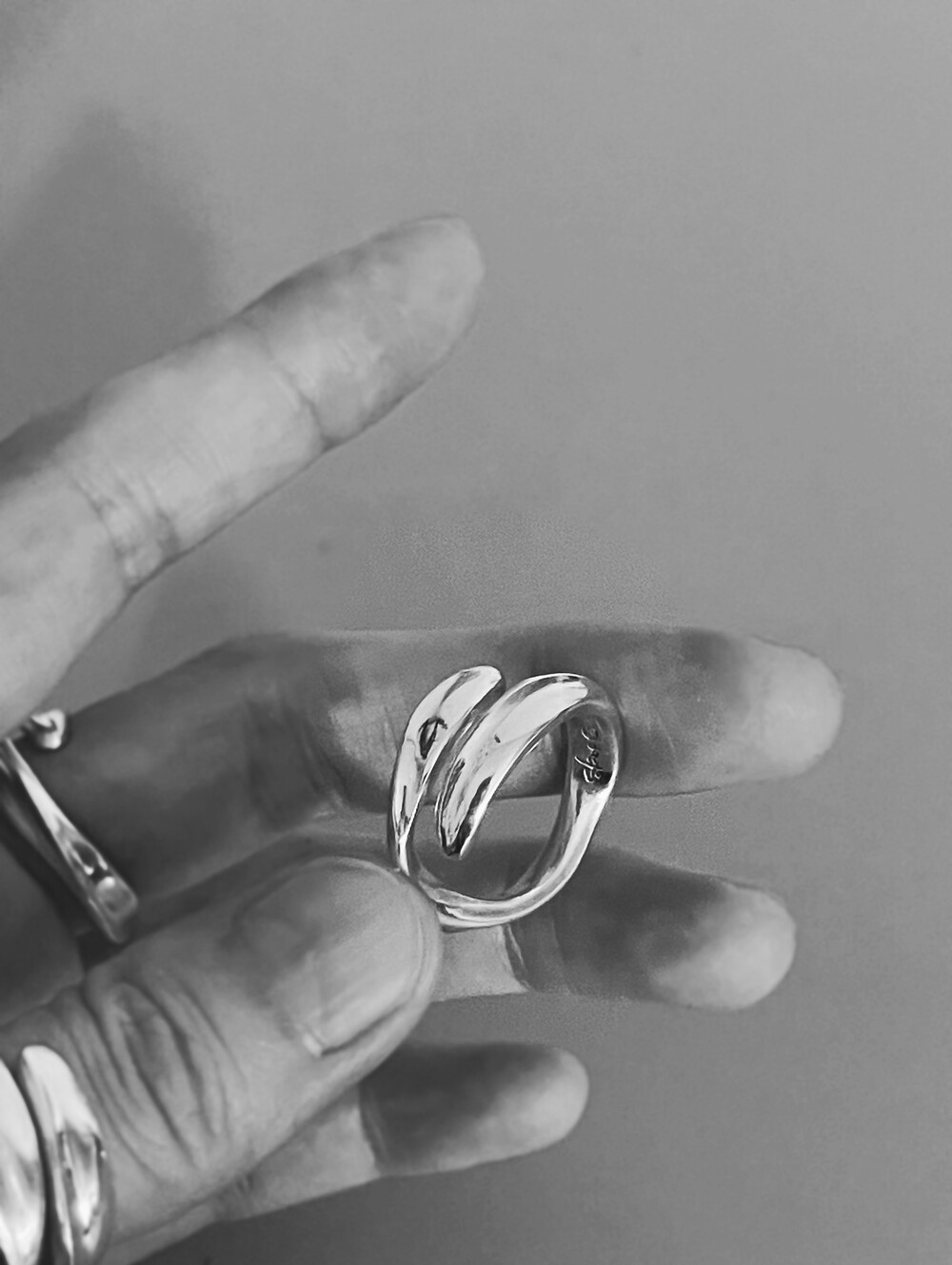 손가락을 감싸는 오픈 형태의 핸드메이드 실버 반지입니다.