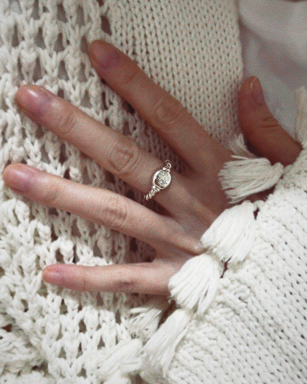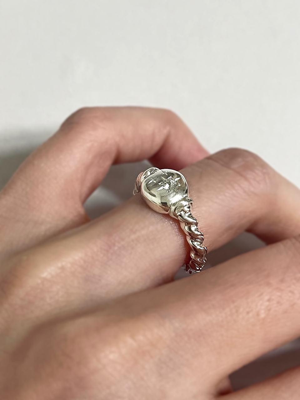불규칙한 꼬임링과 별빛이 반짝이는 듯 손조각된 디테일들이 돋보이는 반지입니다.