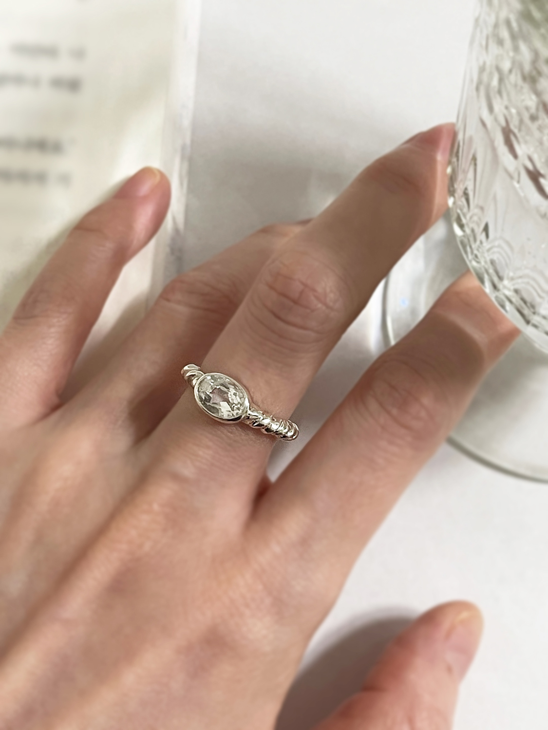 불규칙하게 주름진 꼬임 밴드와 투명하게 반짝이는 토파즈가 잘 어울어지는 반지로